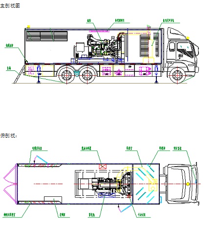 1.2、整車總體布局:箱體與車頭為整體式結(jié)構(gòu),采用箱式貨車改制,箱體采用鋼骨架及蒙皮、內(nèi)部填充消音吸聲材料,箱體分成三個獨立區(qū)域,即排風降噪聲區(qū)、機組設(shè)備工作區(qū)、后艙輔助設(shè)備區(qū)(進氣消聲、電纜線放置區(qū))。機組設(shè)備工作區(qū)內(nèi)設(shè)置有康明斯柴油發(fā)電機組、進風消音風道、防爆照明燈、快速輸出插座等。后艙輔助設(shè)備區(qū)內(nèi)設(shè)備有動力輸出線纜、進氣消音、等裝置。